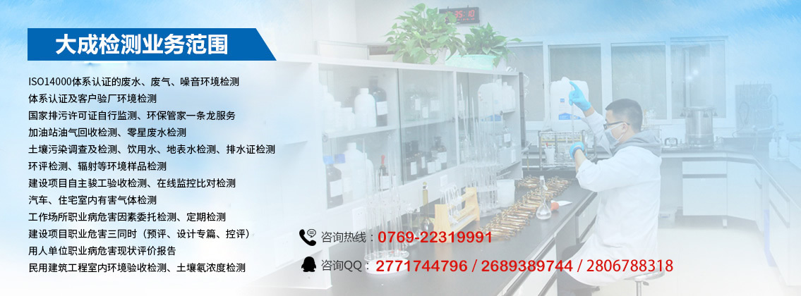 东莞市大成环境检测有限公司 东莞市东城区东升路石井3号综合楼 联系人:周小姐 联系电话:0769-22319991/13712219000 传真:0769-23034300
