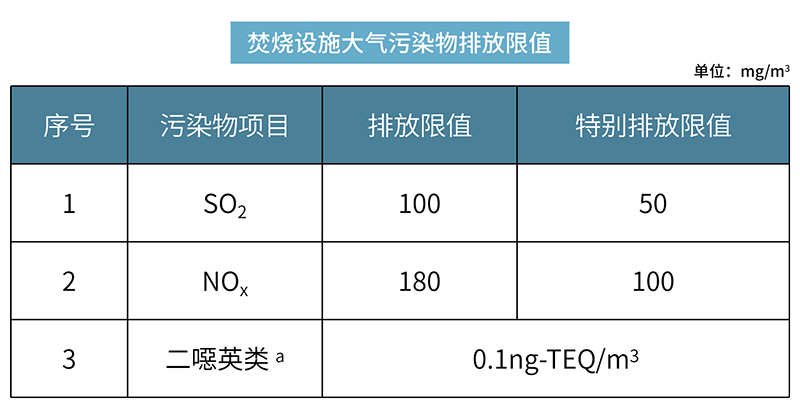 VOCs 燃烧(焚烧、氧化)装置除满足上表的大气污染物排放要求外,还需对排放烟气中的二氧化硫、氮氧化物和二噁英类进行控制,达到下表规定的限值。利用锅炉、工业炉窑、固废焚烧炉焚烧处理有机废气的,还应满足相应排放标准的控制要求。