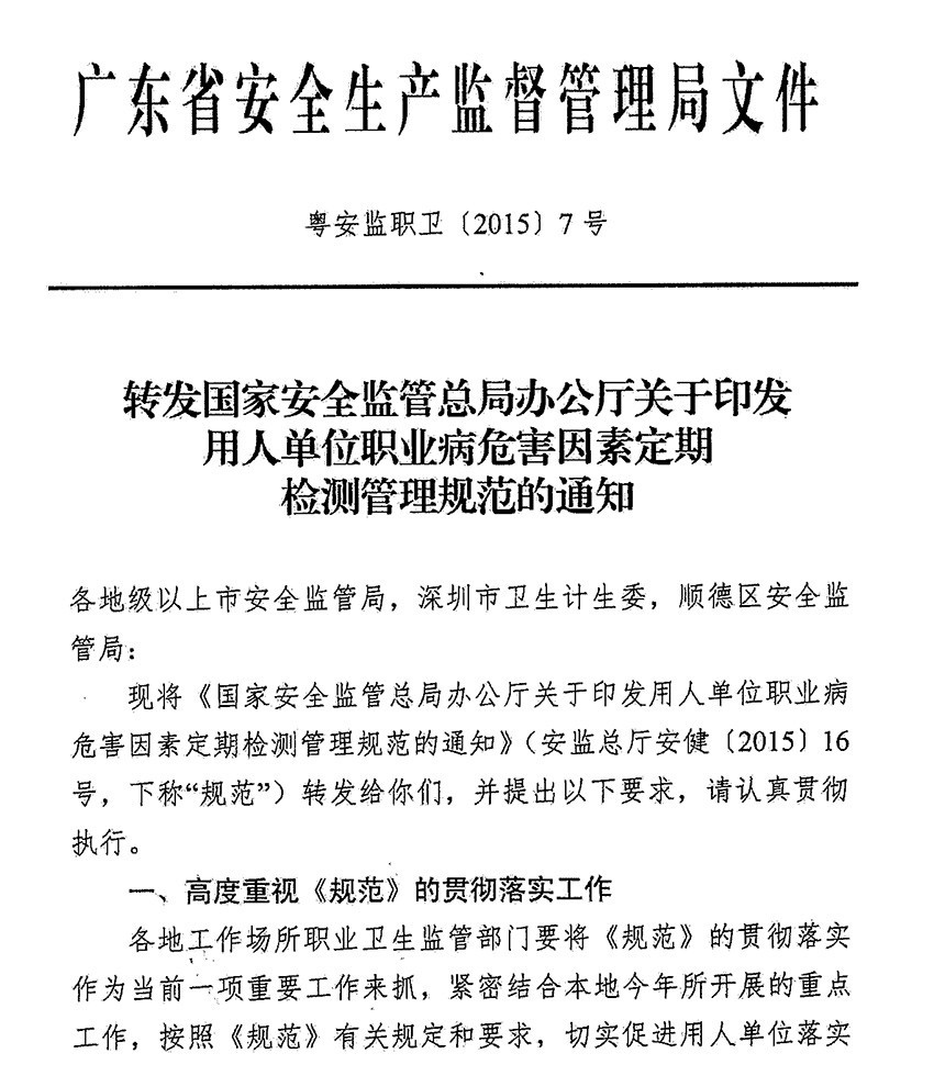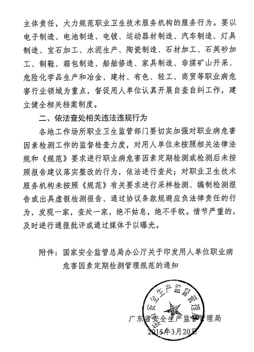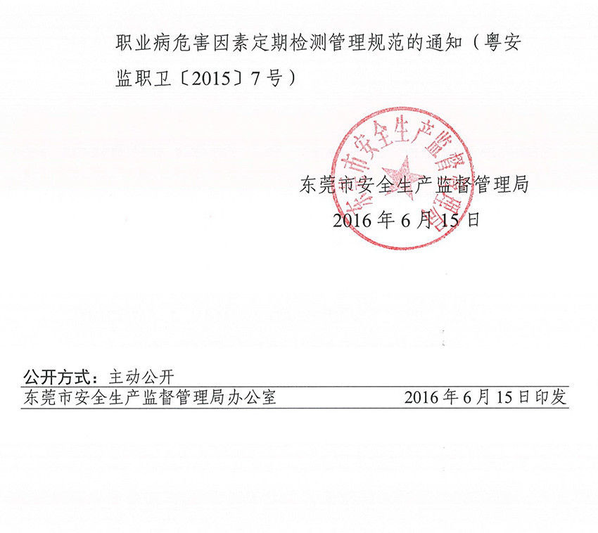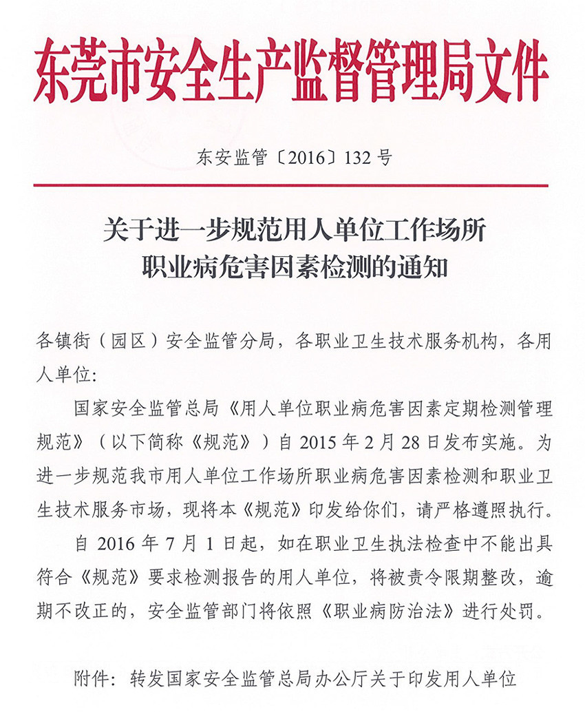 关于进一步规范用人单位工作场所职业病危害因素检测的通知(东安监管(2016)132号