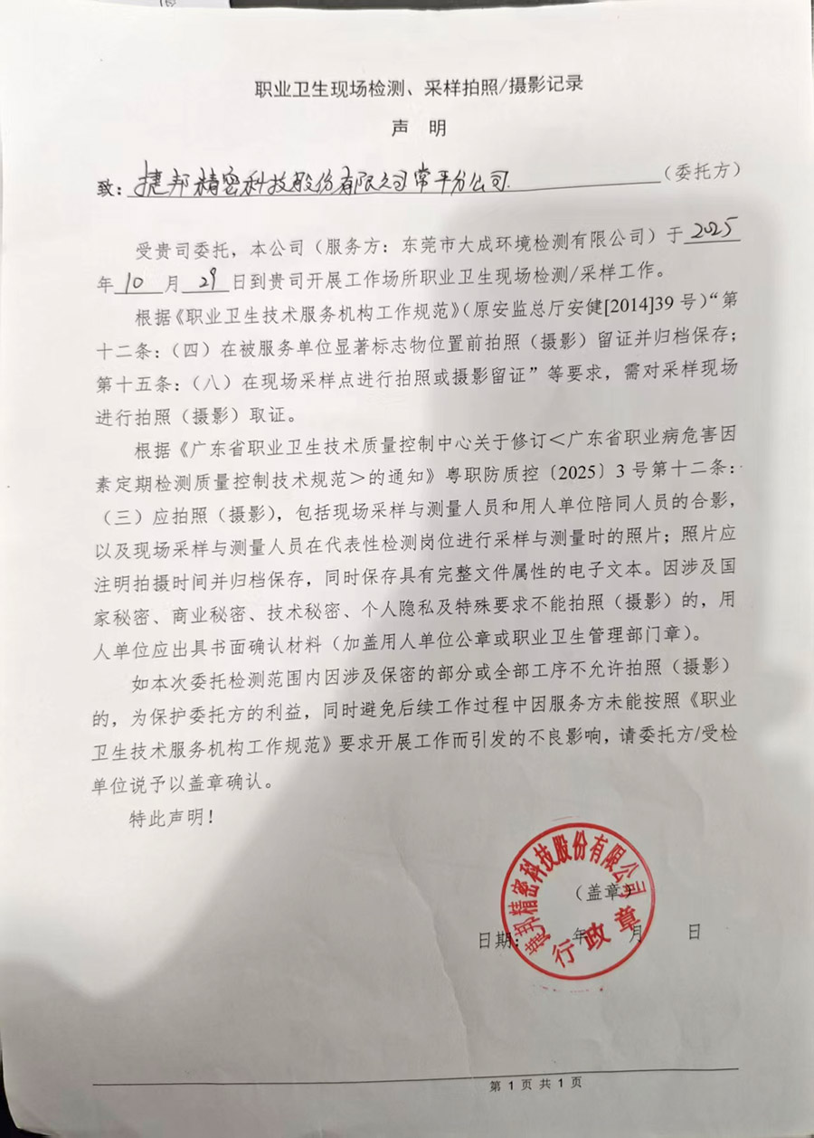 | 报告名称 | 捷邦精密科技股份有限公司常平分公司职业病危害定期检测报告书 | |||||