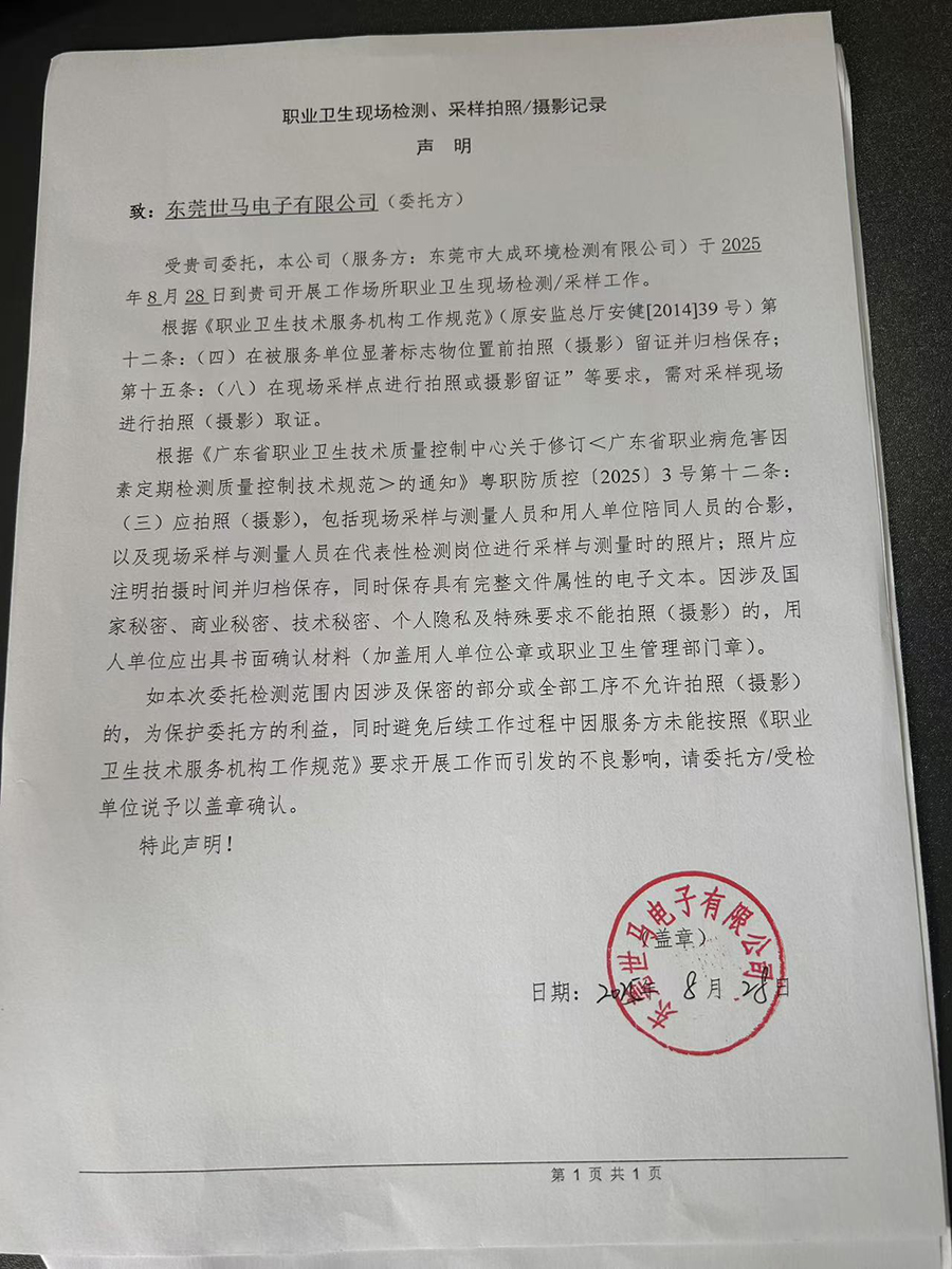 | 报告名称 | 东莞世马电子有限公司职业病危害定期检测报告书 | |||||