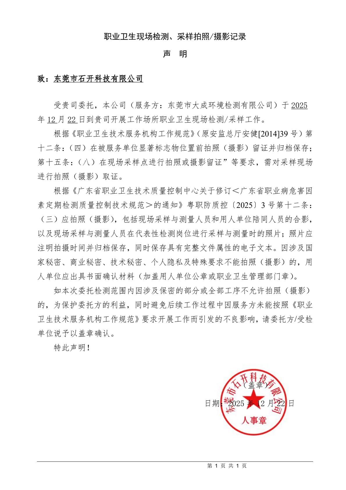 | 报告名称 | 东莞市石开科技有限公司职业病危害定期检测报告书 | |||||
