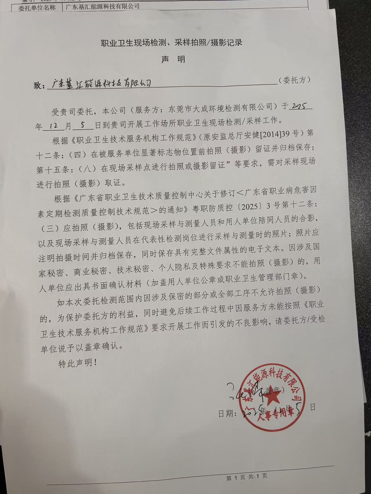 | 采样与测量人员 | 朱俊、黄志诚 | 采样与测量时间 | 2025.12.05 | 用人单位 陪同人 |