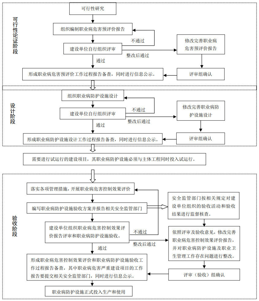 ㅤㅤ根据《建设项目职业病防护设施“三同时”监督管理办法》(国家安全生产监督管理总局令〔2017〕第90号)第三条:建设项目职业病防护设施必须与主体工程同时设计、同时施工、同时。第四条:建设单位对可能产生职业病危害的建设项目,应当依照本办法进行职业病危害预评价、职业病防护设施设计、职业病危害控制效果评价及相应的评审,组织职业病防护设施验收,建立健全建设项目职业卫生管理制度与档案。第五条:国家安全生产监督管理总局在国务院规定的职责范围内对全国建设项目职业病防护设施“三同时”实施监督管理。县级以上地方各级人民政府安全生产监督管理部门依法在本级人民政府规定的职责范围内对本行政区域内的建设项目职业病防护设施“三同时”实施分类分级监督管理,具体办法由省级安全生产监督管理部门制定,并报国家安全生产监督管理总局备案。第九条:对可能产生职业病危害的建设项目,建设单位应当在建设项目可行性论证阶段进行职业病危害预评价,编制预评价报告。第三十九条:建设单位有下列行为之一的,由安全生产监督管理部门给予警告,责令限期改正;逾期不改正的,处10万元以上50万元以下的罚款;情节严重的,责令停止产生职业病危害的作业,或者提请有关人民政府按照国务院规定的权限责令停建、关闭:
